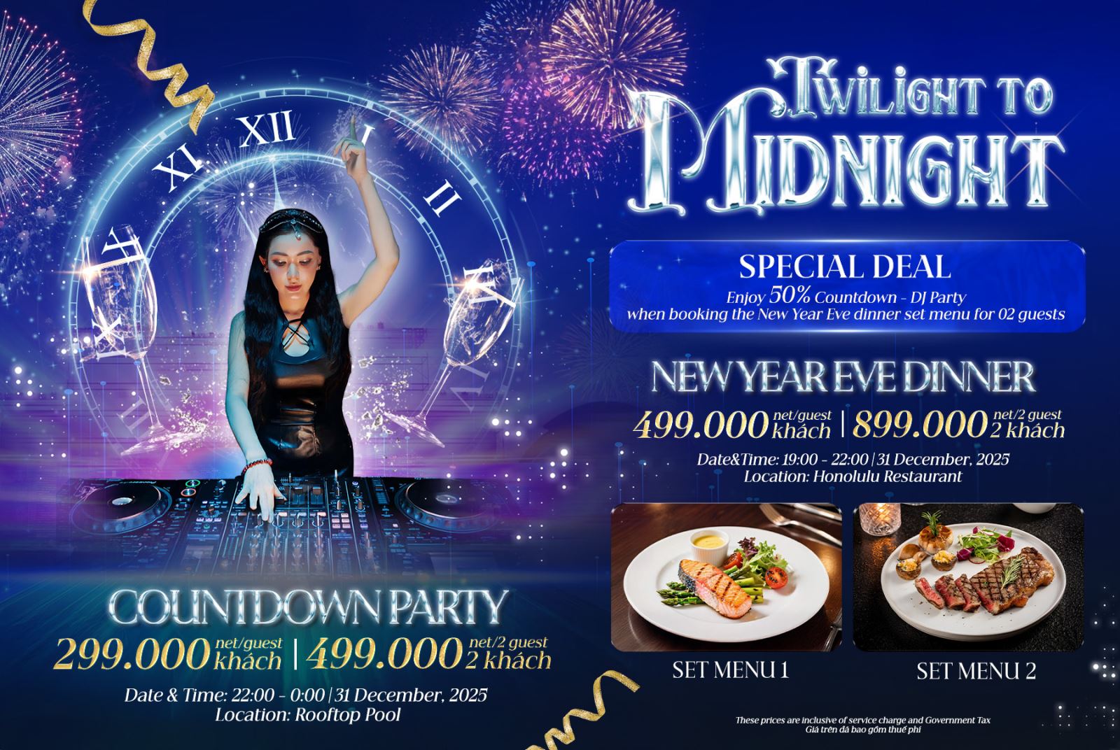 EXCLUSIVE TWILIGHT TO MIDNIGHT OFFER: Book our New Year's Eve Dinner for 2 guests and get 50% OFF the admission ticket for the Countdown DJ Party!