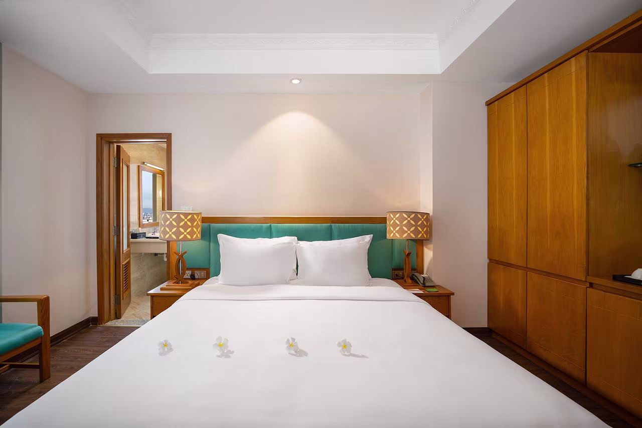 The Junior Double Room offers a cozy and well-appointed space, ideal for couples, family or business travelers seeking comfort and convenience. With a size of approximately 26m², the room is designed with modern interiors and thoughtful amenities to ensure a pleasant stay. Each room features one king-sized bed, dressed in pure white cotton and topped with feather pillows and a lightweight duvet, hand shower, good work area, a flat-screen TV with international channels...